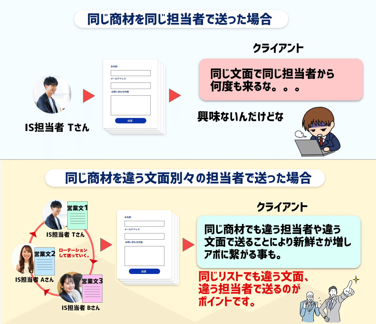 前述の通りですが、できるだけ午前中にまとまった件数を送信することでアポ獲得率を高めます。 一気に1000社送るのは到底、人の力では難しいですし、もし送信担当の方が病気などで会社を欠席した場合は送信できません。 予約送信を活用しAIに任せる事で、送信担当が寝坊しても欠席しても定刻になれば送信処理が自動で開始されます。