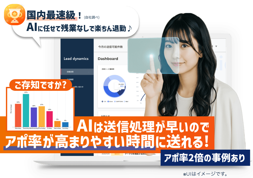 Lead Dynamicsはもっとも簡単なリード獲得支援サービスです。 使いやすいUIと国内複数のサイト分析ノウハウを蓄積したAIで送信できるため送信精度が高いです、誰でも簡単に自動フォームマーケティングを導入することができます。